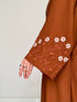 • The standout element: delicate floral embroidery on wide flared sleeves, adding a feminine and contemporary charm.